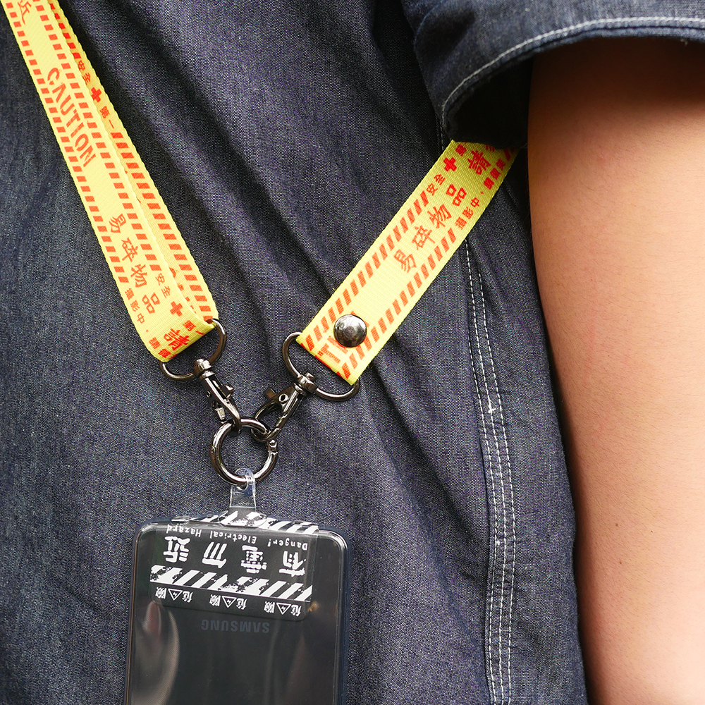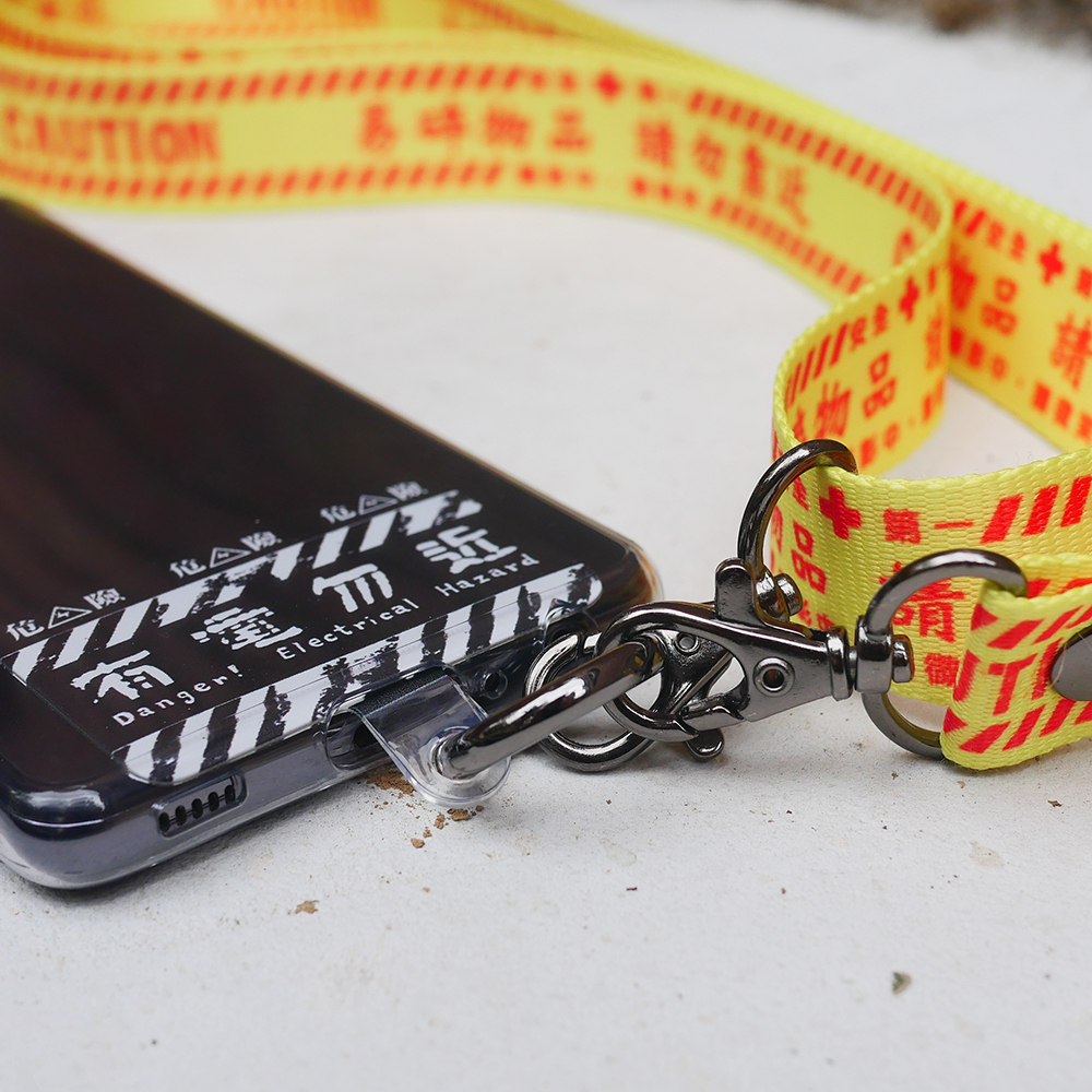 黃布條紅色字樣,一般會出現在危險區域,提醒著人們要多加小心,利用這個概念設計出易碎物品的圖像,彷彿是手機對主人要好好保護我的請求。