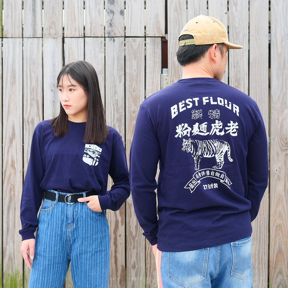 以美援時代的麵粉袋為概念,其實那個時期有非常多不同品牌的麵粉袋都被保存下來,這是一家台灣的老麵粉廠。正面胸口為中美合作LOGO的設計,老虎麵粉圖案在背後,是一種低調的帥氣!